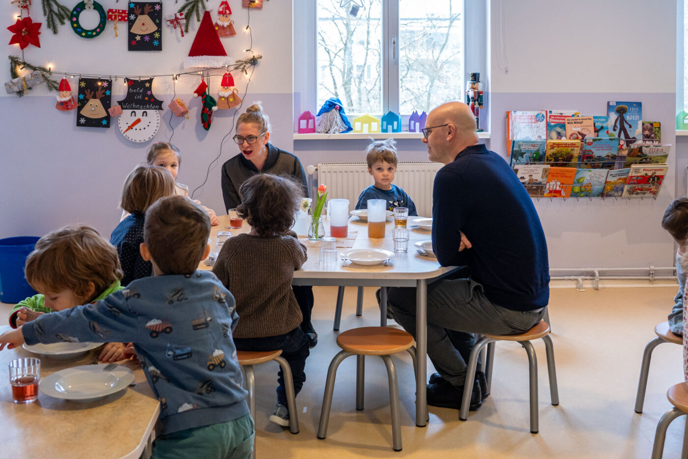 Mit der Kita St. Judas Thaddäus hat im Januar eine Einrichtung ihre Teilnahme an der Kantinen-Werkstatt abgeschlossen, die zugleich die 200. gestartete Küche im Programm ist. Ein Moment, den wir bewusst gemeinsam vor Ort gewürdigt haben – mit Verbraucherschutzsenatorin Dr. Felor Badenberg, der Köchin, Vertreterinnen vom Träger HEDI, Trainer Robert und unseren Projektleiter*innen Dinah Hoffmann und Dr. Philipp Stierand.