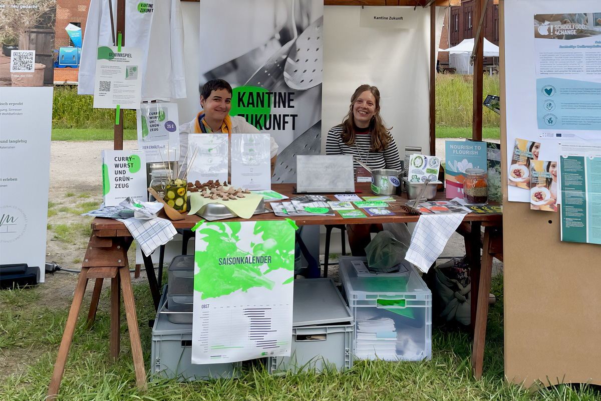 Wir waren mit einem Stand auf dem Markt der Möglichkeiten vertreten. Berenice (Veranstaltung & Vertrieb) und Julia (Öffentlichkeitsarbeit) haben dort viele spannende Menschen und Multiplikator*innen getroffen, über unsere Arbeit berichtet und Erfolge aus der Kantinen-Werkstatt geteilt. Besonders beliebt: unsere Materialien und die „Kantine macht glücklich“-Sticker, Postkarten und Magnete, die mit ihrer frischen Bildsprache Gesprächsanlässe geschaffen und gezeigt haben, dass Kantine alles andere als angestaubt ist. Und natürlich durfte auch etwas zu probieren nicht fehlen: Die eingelegten Gurken, der Lagerfeuer-Aufstrich aus Räuchertofu und Kidneybohnen und die Schoko-Kichererbsen-Creme auf Knäckebrot waren schnell aufgegessen. Perfekte Praxisbeispiele dafür, wie man Hülsenfrüchte wunderbar mit beliebten Geschmäckern kombinieren kann.