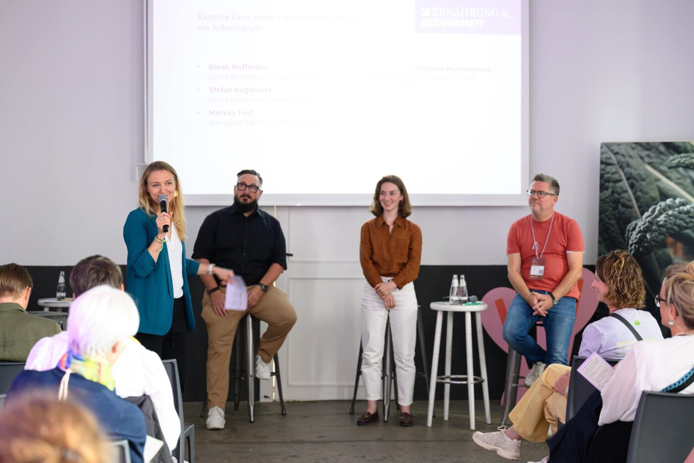 Ein weiterer Höhepunkt war das Panel „Kantine kann mehr – gesunde Ernährung am Arbeitsplatz“. Unsere Projektleiterin Dinah Hoffmann diskutierte mit Stefanie Kratzenstein (Food Campus Berlin), Stefan Köglmeier (Essfrequenz/Brainlab) und Markus Tust (SODA Group), welche Hebelwirkung Kantinen bei Klima-, Gesundheits- und Gerechtigkeitsfragen haben. Das Publikum schlüpfte in verschiedene Rollen – vom „desinteressierten Fast-Fooder“ bis zur leidenschaftlichen Küchenkraft und machte so erlebbar, wie unterschiedlich die Perspektiven sind.